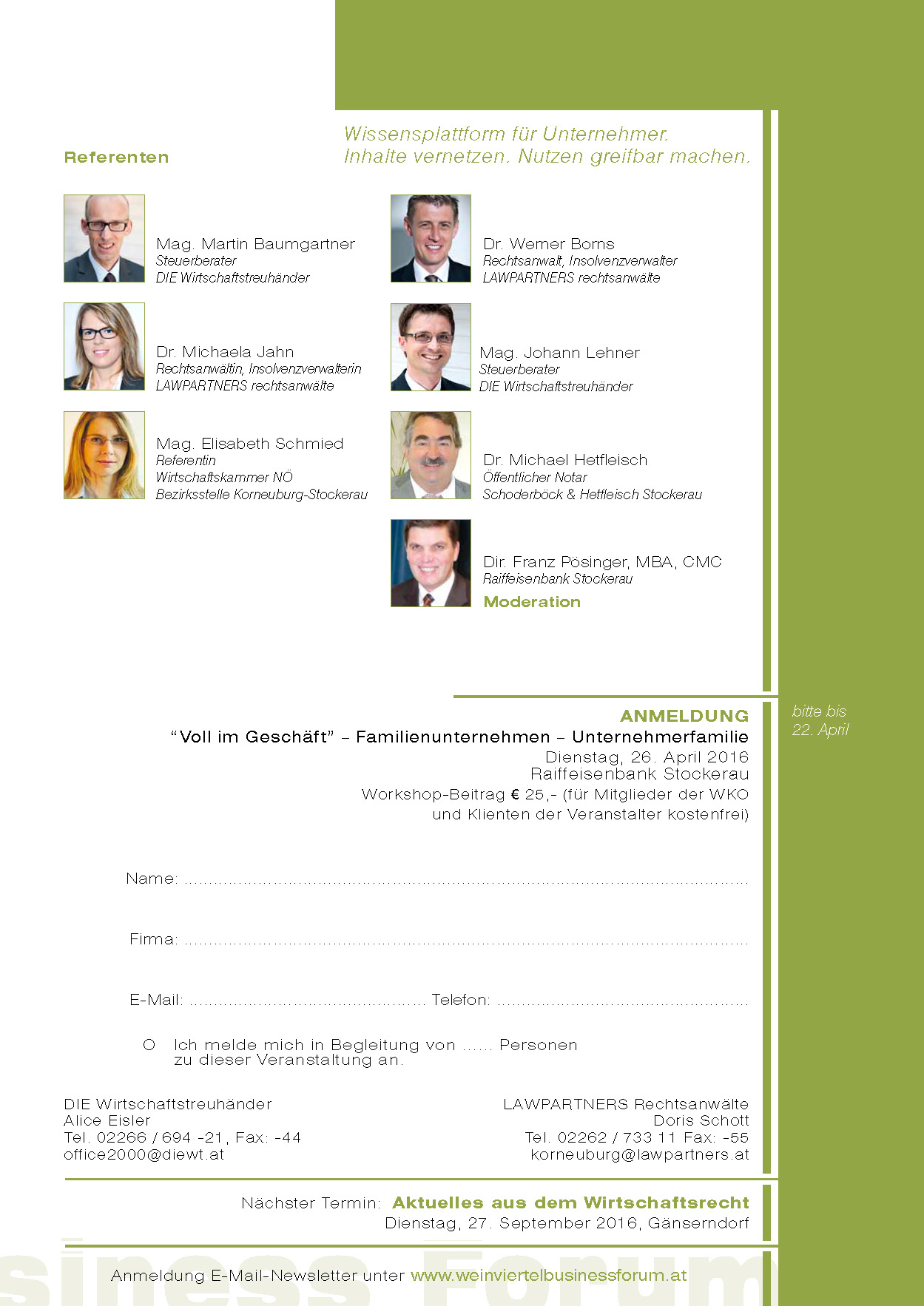 Diese Veranstaltung des Weinviertel Business Forums befasste sich im Schwerpunkt mit jenen wirtschaftlichen, rechtlichen und steuerlichen Aspekten, die den laufenden Betrieb eines Familienunternehmen betreffen.